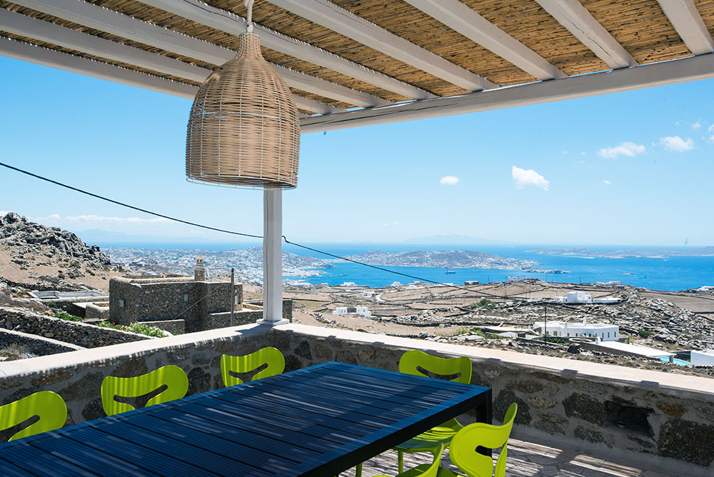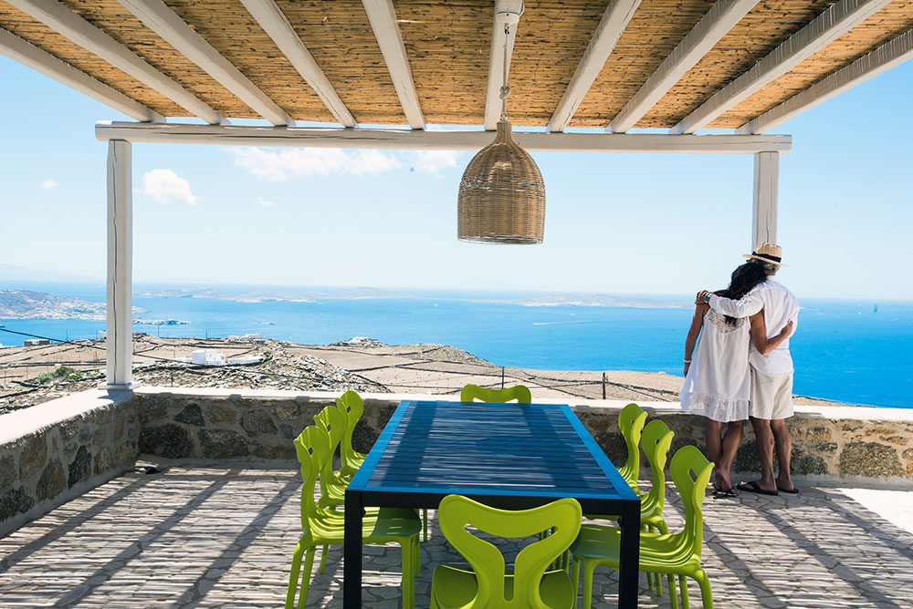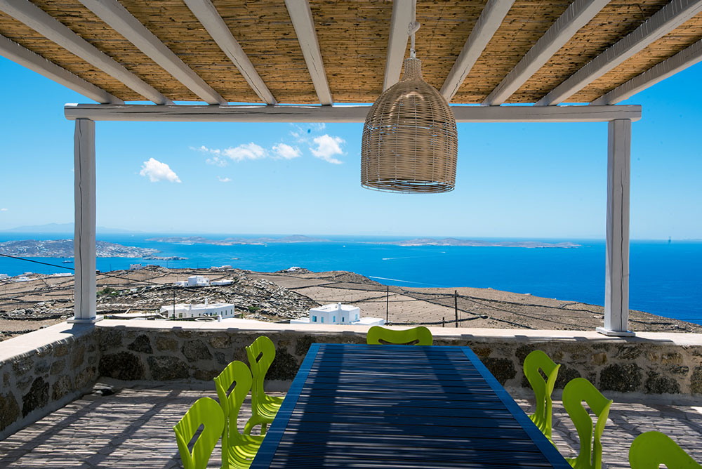 • Shaded pergola with dining facing the Aegean Sea, the port and town of Mykonos.